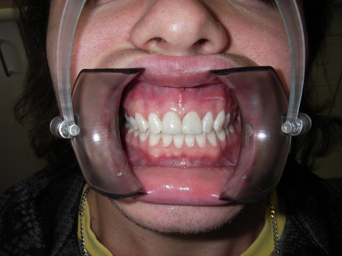 Calculus covers this patients teeth. They had not seen a dentist in greater than 15 years. After a couple of scaling appointments the teeth and gums tissue are in a much healthier state.
