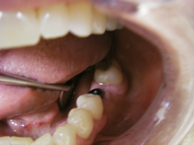 The titanium implant itself is below the gumline and fused to the bone already in this case. The metal substructure you see is the healing abutment. It is removed and an impression is made to then fabricate a tooth that fits the space to be replaced. In this case, the implant crown was screwed down to an abutment vs cemented.